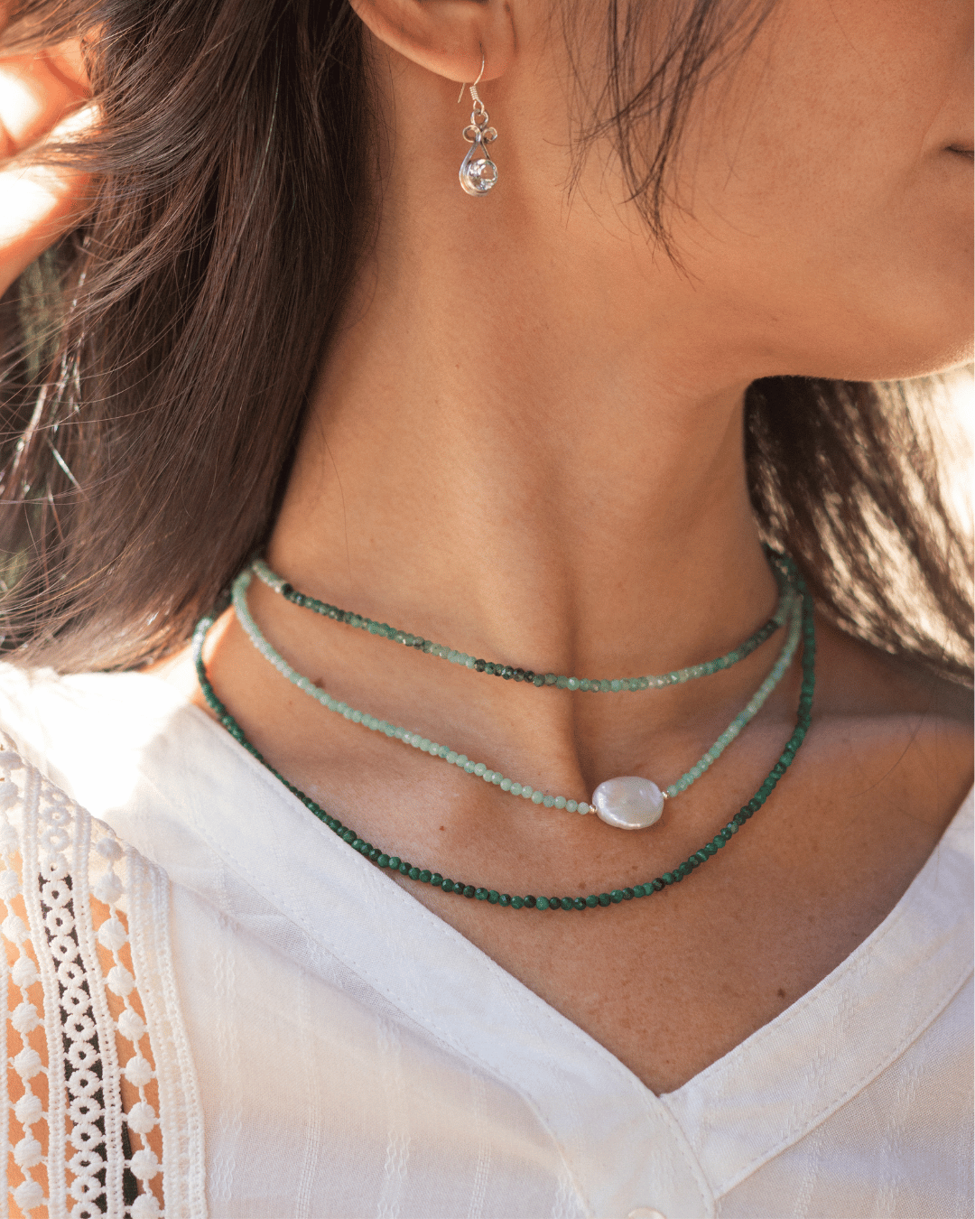 Feito à mão com delicadeza e intenção, este colar traz pequenas pedras de malaquita naturais, unidas por um acabamento em prata 925 que valoriza sua cor verde intensa e vibrante.