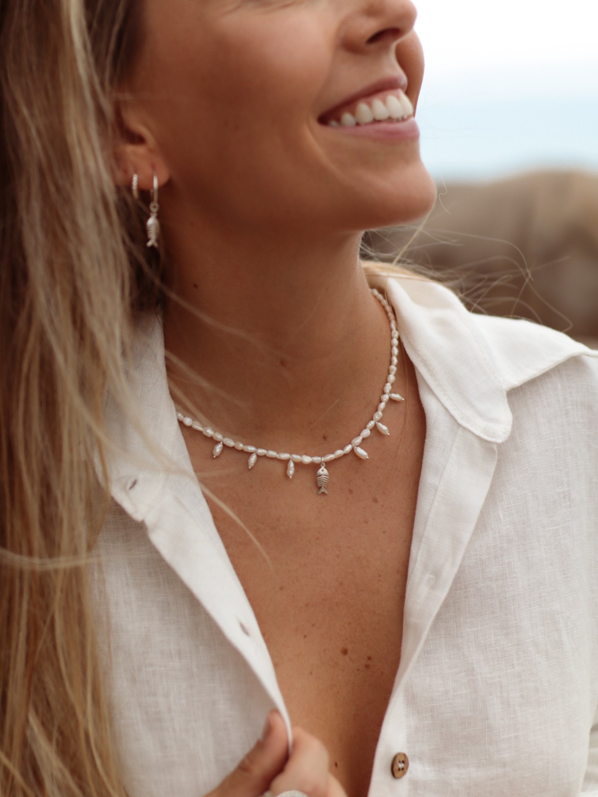 Feito à mão em nosso ateliê o Colar Oceano combina a delicadeza das pérolas de água doce em formato arroz com o charme das perolinhas pendentes que adicionam movimento e leveza ao design. No centro, um esqueleto de peixe em prata 925 traz o toque final.