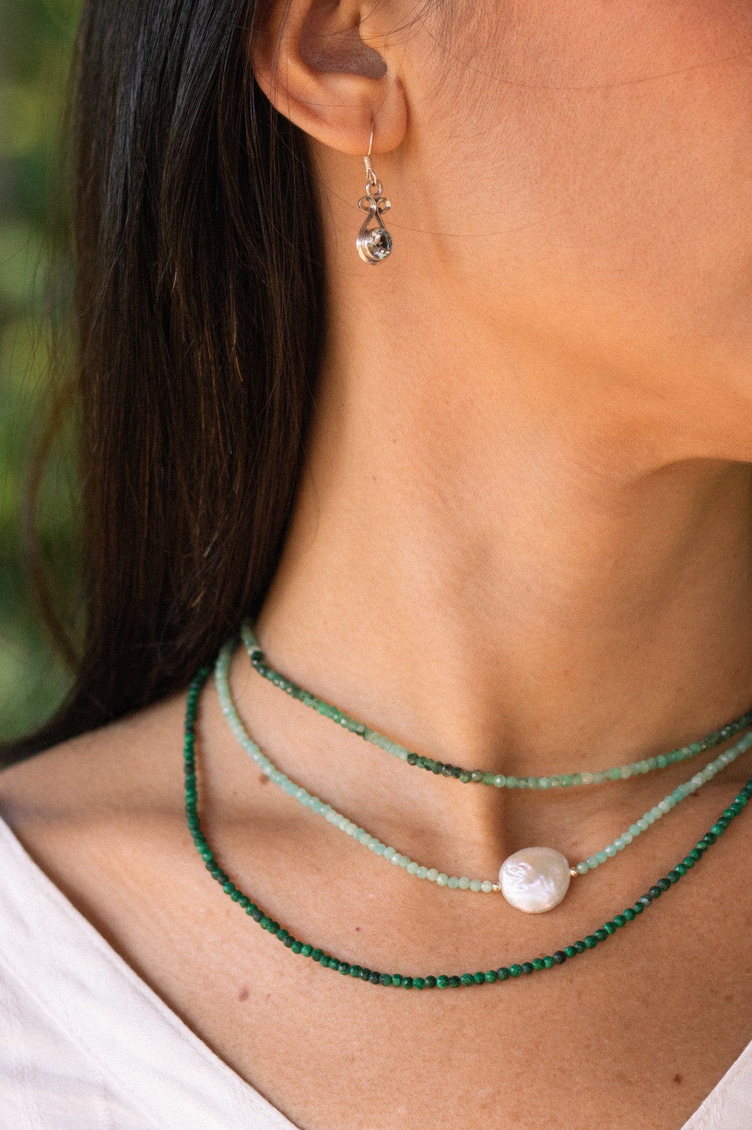 A Gargantilha Amazonita com Pérola de Água Doce é uma joia delicada e vibrante, feita à mão com mini pedras facetadas de amazonita que irradiam frescor e serenidade. No centro, uma pérola natural de água doce completa a peça com sua pureza e luminosidade únicas.