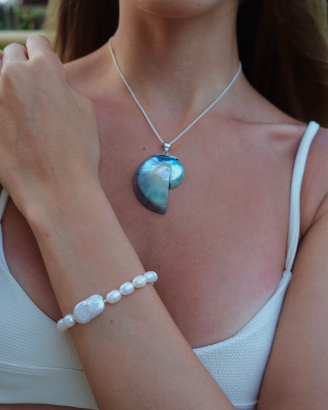 Pingente em formato de concha nautilus cuidadosamente trabalhado com prata 925 e madrepérola em tons que vão do branco até o azul perolado. Com detalhes minuciosos em prata estilo Bali, esta peça é perfeita para quem busca um acessório autêntico.